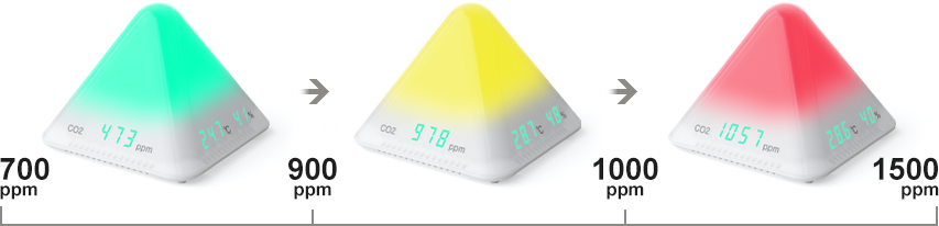 CO2の濃度が上がると、LEDの色が緑、黄、赤の順に変化します。カバー全体が光るので離れていても、また様々な角度からも見やすく安心です。