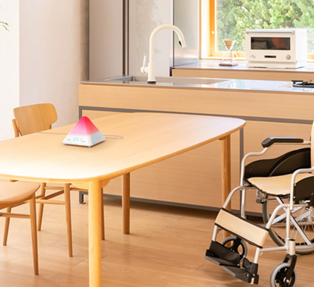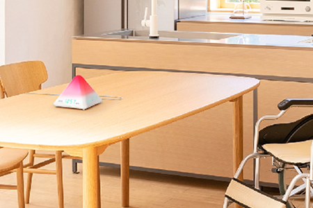 シンプルながら、特徴的で目立ちやすいピラミッド型形状により、 「換気」のタイミングをどこからでも見やすく、LEDの色の変化で分かりやすくお知らせします。コンパクトタイプなのでさまざまな場所に設置できます。