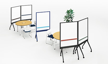 オフィスの中を“歩く”ように移動できる、軽やかなホワイトボード。「ALKU(アルク)」は、パーティションとして空間を仕切りながら、ホワイトボードとしての書きやすさと、どこへでも動かせる機動性を兼ね備えた、新しいワークスタイルのためのツールです。さらに新モデルでは、ブラックフレームタイプに「アクセントカラー付きトレイ(4色)」を追加。空間に彩りと個性をプラスできます。